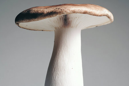 A large, elegant white mushroom with a brown cap against a minimalist gray background showcasing its delicate structure and natural beauty, ideal for culinary concepts