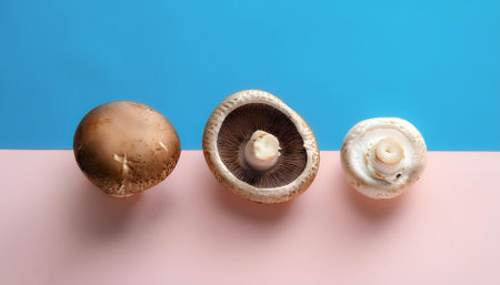 Shiitake and portobello mushrooms lie, isolated on a soft blue and Pink Pastel