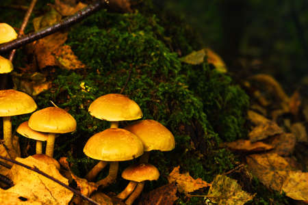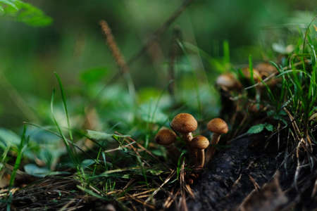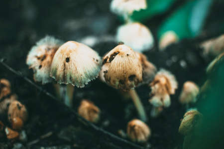 Group of mushrooms growing in the forest. Selective focus. Shallow depth of field