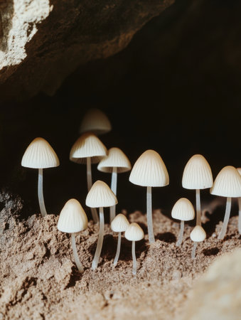 Delicate White Mushrooms Growing in Dark Cave Nature Photography cap soil stem gill rock wild life