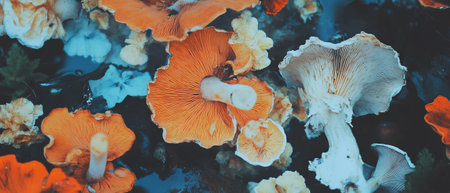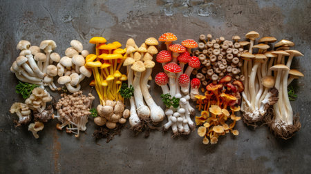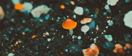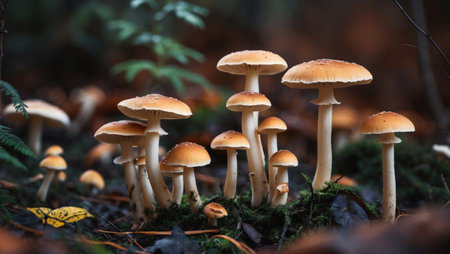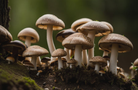 Mushrooms thrive on rich soil with varied textures and colors in natures habitat