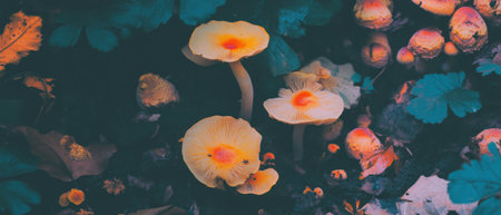 AI Generated. Glowing mushrooms and fallen autumn leaves in misty woodland