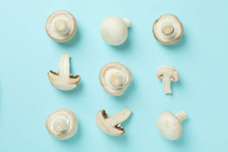Flat lay composition with champignons on blue background