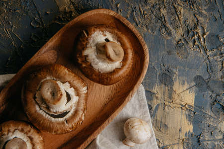 Brown raw mushrooms on a wooden plate