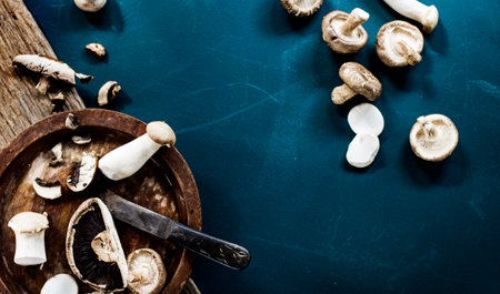 Raw mushroom with knife and wooden plate