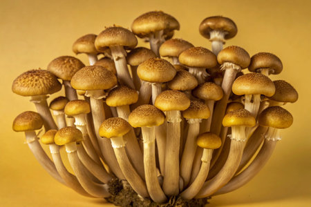 Bunch of brown shimeji mushrooms on a yellow background.