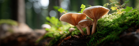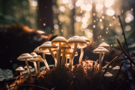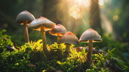 Mushrooms growing in a forest, bathed in the soft light of sunrise, creating a serene and magical atmosphere. Ideal for themes of nature, forests, and tranquility.