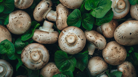 A natural and earthy arrangement of fresh button mushrooms accompanied by green leaves, creating an organic and wholesome culinary aesthetic.