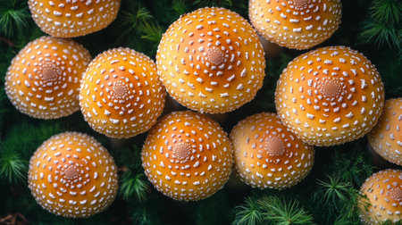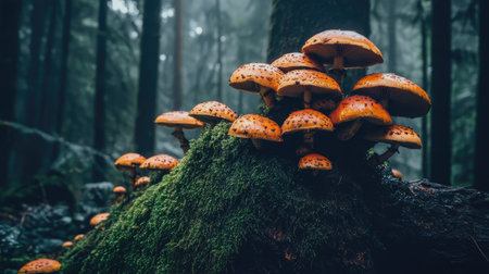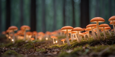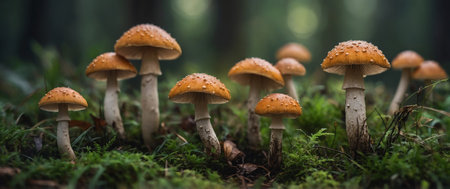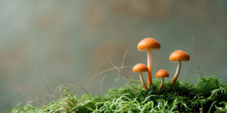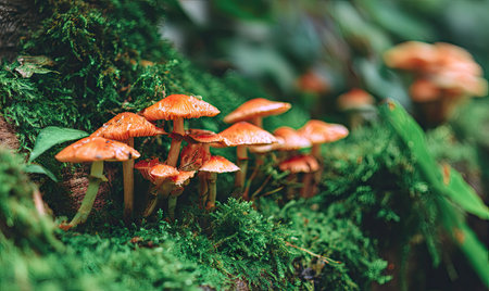 A collection of orange mushrooms is displayed, growing amongst green moss. The scene features shallow depth of field, with soft focus on some elements. The color palette emphasizes orange and green hues. Suitable for use in visual content related to nature, health, or environmental themes, also for various editorial projects.