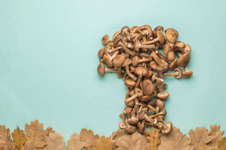 A mushroom figure made of a large number of small mushrooms and oak leaves on a blue background. Natural vegetarian food from the forest.