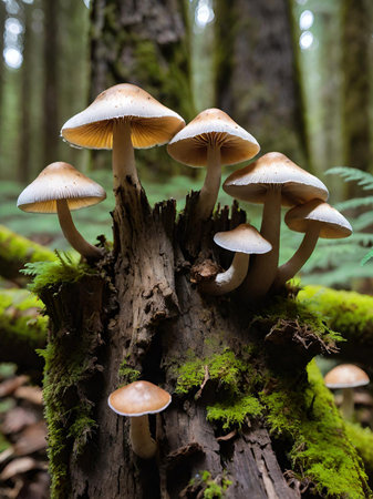 A group of mushrooms sitting on top of a tree stump. Generative AI image.