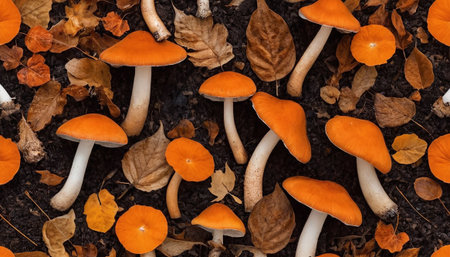 presents a detailed overhead view of various orange mushrooms nestled on dark soil, accompanied by scattered dried autumn leaves. The fungi exhibit a range of shapes and sizes, with some caps featuring subtle white speckles. The fallen leaves are in hues of yellow, orange, and brown, contributing to the autumnal atmosphere. The dark soil provides a contrasting base, allowing the vibrant colors of the mushrooms and leaves to stand out. The composition is rich in texture and natural detail.