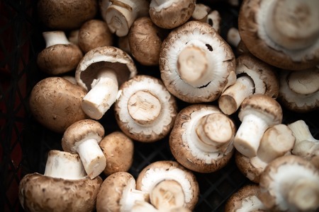 Background of fresh and organic whole mushrooms, closeup