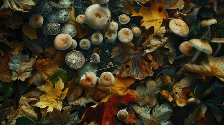 A scenic view of a forest floor covered in various types of mushrooms and fallen leaves.