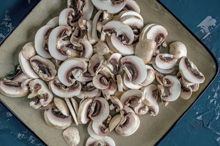 Pieces of cut mushrooms abstract background . Close up.