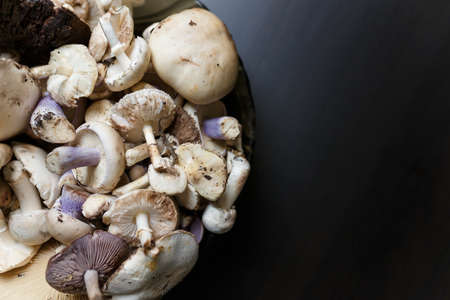 Raw champignon and tricholoma mushrooms on black wooden table. Healthy organic vegetarian food. Diet, nutrition, eating habits concept. Copy space