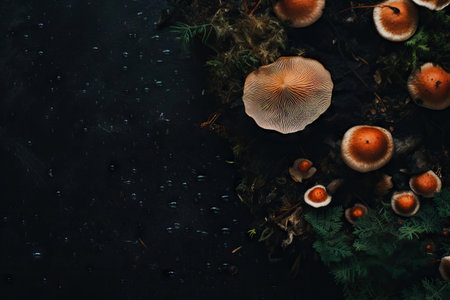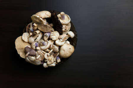 Close up shot of fresh forest dirty champignon and tricholoma mushrooms on black background. Raw healthy organic vegetarian food. Diet, nutrition and eating habits concept. Place for text.