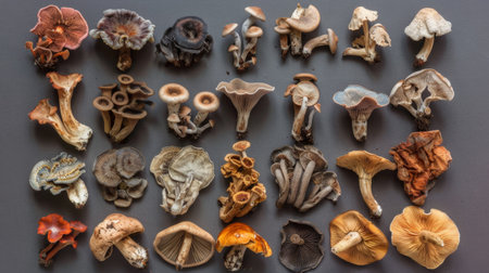 Varied colors and textures of dried mushrooms create a vibrant natural display