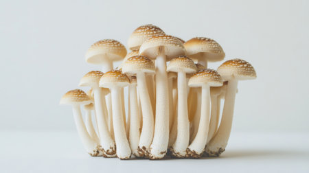 A neat cluster of Yanagi mushrooms standing upright on a minimalist white surface, with the slender stems creating an elegant vertical composition