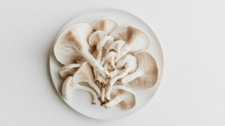 A bunch of Champignon mushrooms arranged on a white plate, showing their natural shape and color, with a simple white background for emphasis.