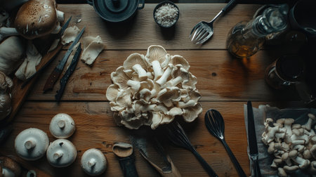 A vibrant display of fresh mushrooms on a wooden table, perfect for culinary creations. Ideal for food photography, cooking blogs, and recipe books.