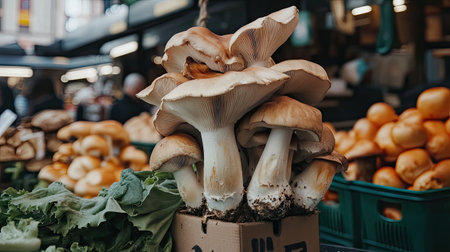 A captivating image of fresh and organic mushrooms beautifully displayed at a local market, surrounded by vibrant vegetables, evoking a sense of healthy living and culinary inspiration.