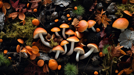 A vibrant arrangement of bright orange mushrooms and scattered autumn leaves is presented from an overhead perspective on a dark, textured surface. The mushrooms, in various stages of growth, showcase their distinct orange caps and white stems. Interspersed among the fungi are fallen leaves in shades of orange, brown, and yellow, contributing to the rich autumnal palette. The dark, almost black background accentuates the vivid colors and intricate textures of the mushrooms and leaves,...