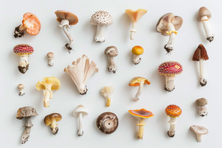 Assorted freshly picked mushrooms of different sizes and varieties arranged on white background