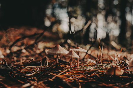 Mushrooms growing in a forest, a natural and earthy scene. These small mushrooms are growing in a bed of pine needles, creating a beautiful natural scene. Autumnal forest in a gloomy day.