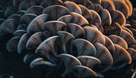 A detailed close-up captures the intricate gills and caps of oyster mushrooms clustered on a tree trunk, showcasing their unique texture and natural beauty.