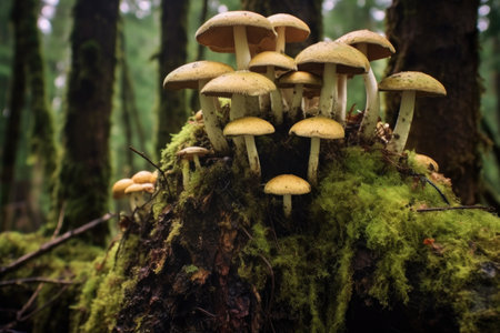 A group of mushrooms sitting on top of a tree stump. Generative AI image.