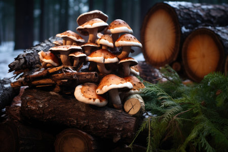 homegrown shiitake mushrooms on wooden logs, created with generative ai