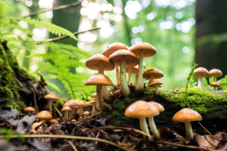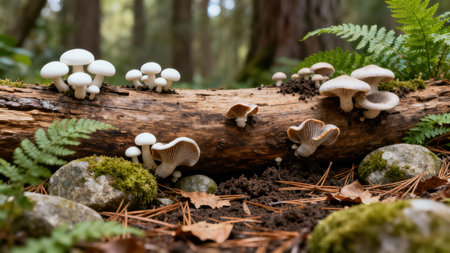 mushrooms sprouting from a fertile tree trunk, created with generative ai