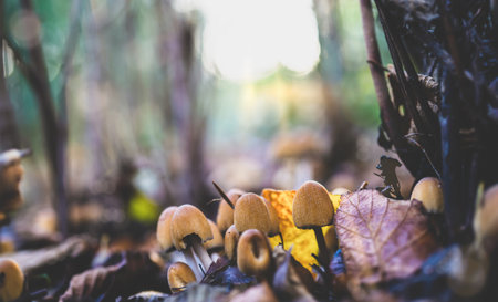 Enchanting scene tiny mushrooms emerge from fallen leaves white caps glowing in filtered light