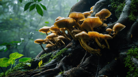 Discover a stunning cluster of golden mushrooms thriving on ancient tree roots, surrounded by a lush green forest. Experience the rich biodiversity and serene beauty of nature.
