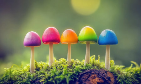 Colorful mushrooms arranged in a line on a mossy log, with a soft-focus background of greenery