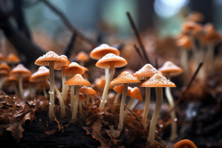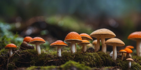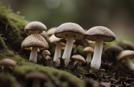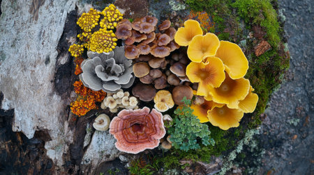 Mushrooms thrive on rich soil with varied textures and colors in natures habitat