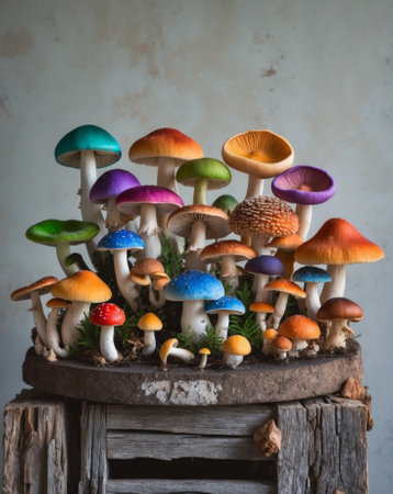 AI Generated. Variety of Colorful Wild Mushrooms on Wooden Surface