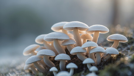 AI Generated. A Delicate Cluster of Fungal Structures Exhibiting a Frosty Texture Under Soft Light