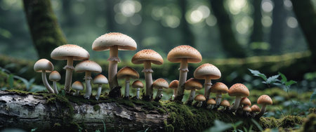 A captivating image of several mushrooms growing on a damp log in a forest. Water droplets adorn their vibrant caps.