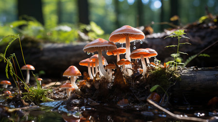 AI Generated. The image shows a group of mushrooms growing on a log in the woods