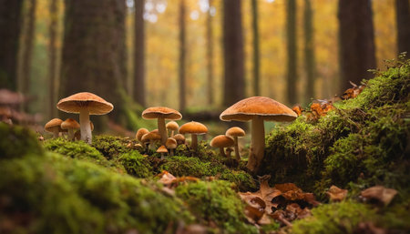 A close-up of mushrooms growing on the forest floor, surrounded by fallen autumn leaves, in warm, golden sunlight, evoking the natural beauty of forest ecosystems.