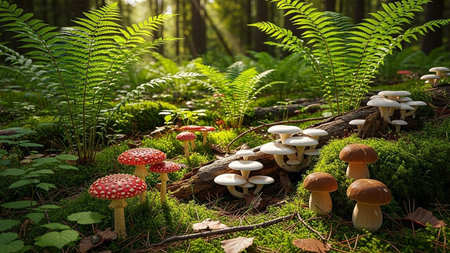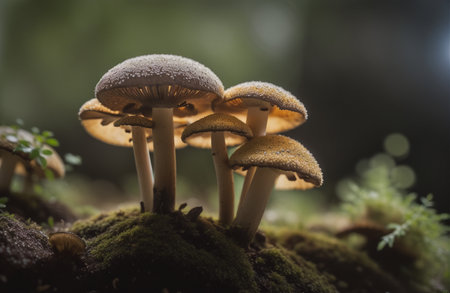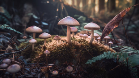 Enchanting forest mushrooms illuminated by soft afternoon light. Nature aesthetics, fungi close-up, woodland scene, environmental beauty concept.