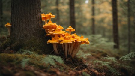 wild mushroom foraging, a cluster of chanterelle mushrooms spotted up close on a tree trunk deep in the woods wild fungi exploration at its finest