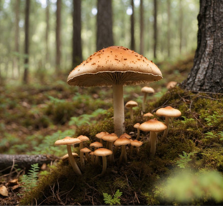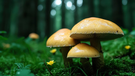 A group of mushrooms sitting on top of a lush green forest. Generative AI image.