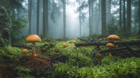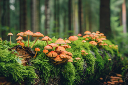 Colorful orange mushrooms thrive on a mossy log amidst tall trees in a peaceful forest, capturing the essence of autumn nature in soft light.