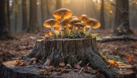 AI Generated. Mushrooms Growing on a Decaying Tree Stump in Mist