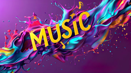 Music text font with splashes of paint on purple background. Colorful lettering design. Typographic inscription. Fun poster. Handwritten lettering.