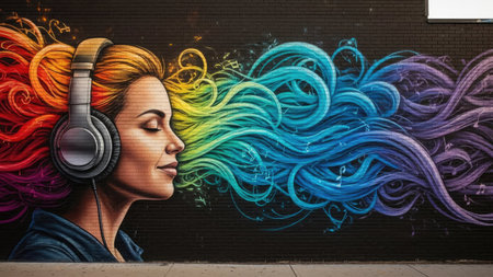 A woman wearing headphones is depicted with flowing, colorful hair emanating musical notes. The artwork features a vibrant spectrum of colors and highlights the abstract representation of sound. This image might be suitable for use in promotional materials for music, technology, or creative industries and is suitable for commercial and editorial purposes.