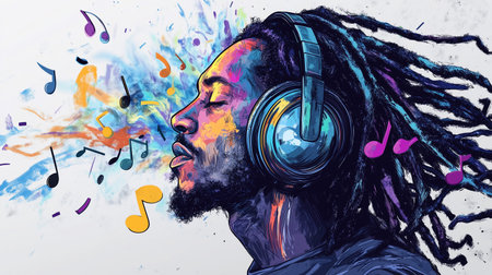 vibrant illustration of a man with dreadlocks, colorful wearing headphones, immersed in music as musical notes and colorful swirls flow from his mind, capturing the essence of creativity and sound.
